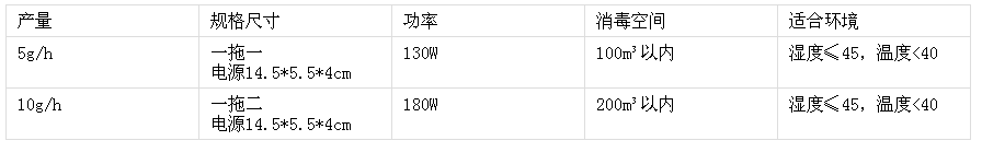 10g/h | 一拖二 電源14.5*5.5*4cm | 180W | 200m3以內(nèi) | 濕度≤45,溫度<40 |